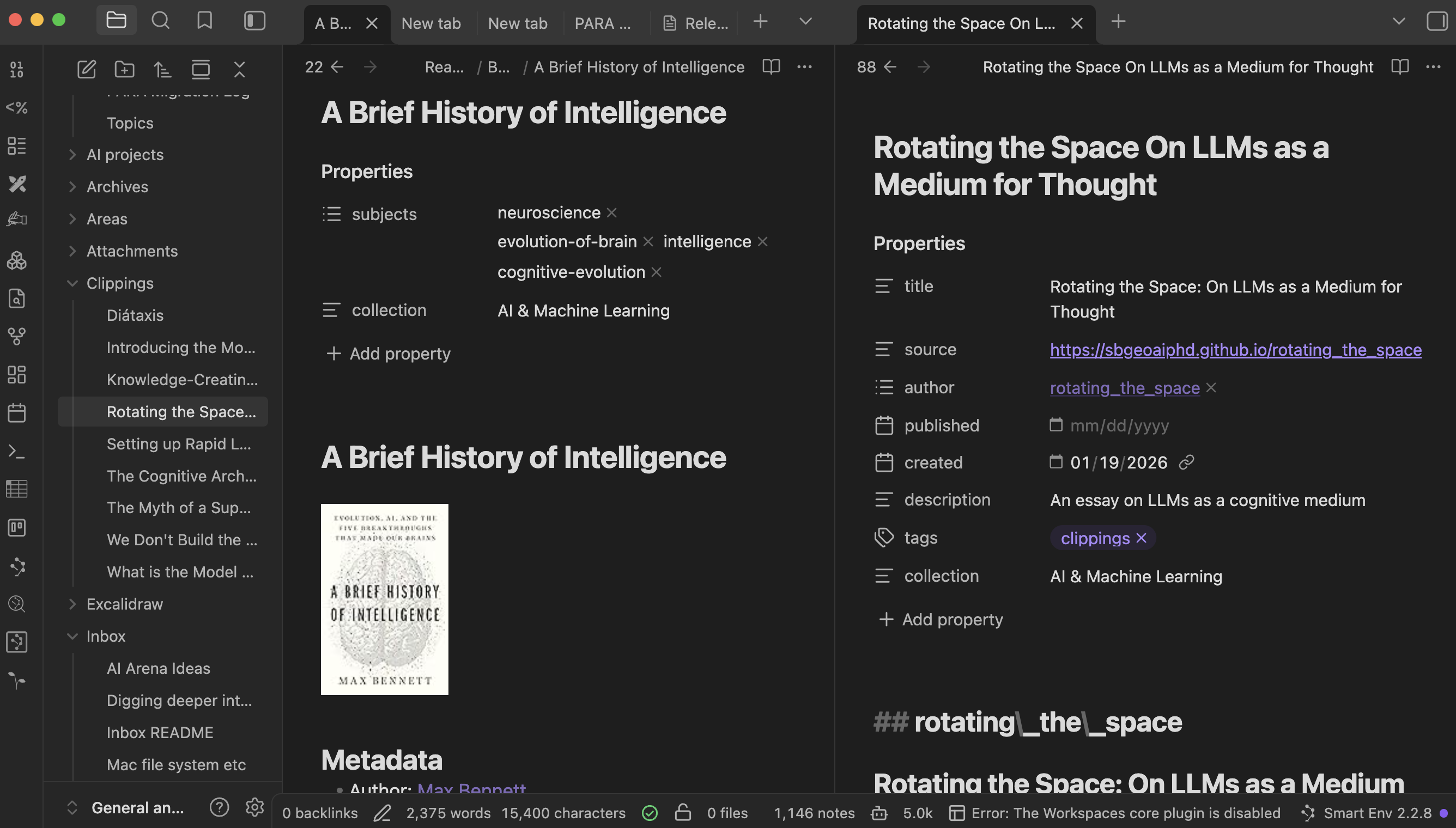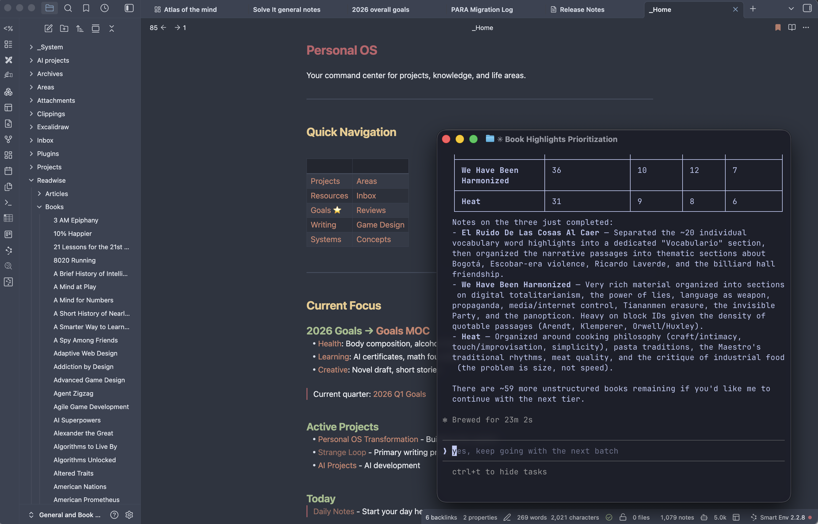 As mentioned above, Obsidian is a great place to dump your book highlights. It’s also a great place to work through your task lists, to do your free writing every morning, to capture Web highlights you would have otherwise lost. Some novelists use it for world building since they need a place where they can keep all their interconnected ideas all together. I even publish my blog directly from my Obsidian vault. There are a ton of builtin plugins for Obsidian and a million and one community plugins to explore. My main advice would be, don’t get overwhelmed by all the options. Find one or two applications you love and start there. In the past, a huge blocker for a lot of people was the issue of having a huge mess of notes locked away in their vault and didn’t have the time or inclination to really try and organize it. With tools like Claude Code, that issue has disappeared.
